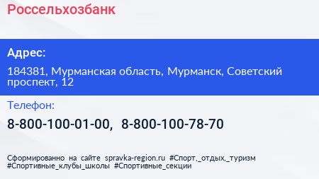 Россельхозбанк по адресу 184381, Мурманская область, Мурманск, Советский проспект, 12 в дальнейшем Организация, размещена в следующих категориях: