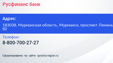 Русфинанс банк по адресу 183038, Мурманская область, Мурманск, проспект Ленина, 82 в дальнейшем Организация, размещена в следующих категориях: