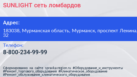 SUNLIGHT, сеть ломбардов по адресу 183038, Мурманская область, Мурманск, проспект Ленина, 32 в дальнейшем Организация, размещена в следующих категориях: