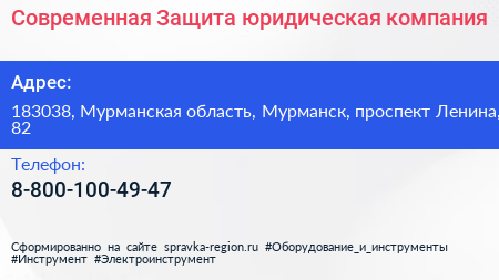Современная Защита, юридическая компания по адресу 183038, Мурманская область, Мурманск, проспект Ленина, 82 в дальнейшем Организация, размещена в следующих категориях: