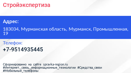 Стройэкспертиза по адресу 183034, Мурманская область, Мурманск, Промышленная, 19 в дальнейшем Организация, размещена в следующих категориях:
