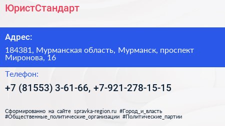 ЮристСтандарт по адресу 184381, Мурманская область, Мурманск, проспект Миронова, 16 в дальнейшем Организация, размещена в следующих категориях: