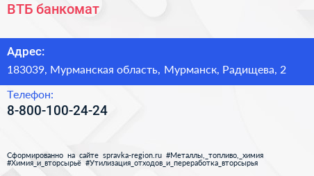 ВТБ, банкомат по адресу 183039, Мурманская область, Мурманск, Радищева, 2 в дальнейшем Организация, размещена в следующих категориях: