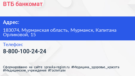 ВТБ, банкомат по адресу 183074, Мурманская область, Мурманск, Капитана Орликовой, 15 в дальнейшем Организация, размещена в следующих категориях: