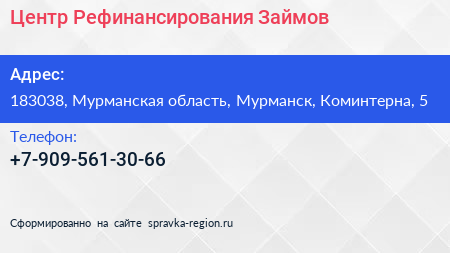 Центр Рефинансирования Займов по адресу 183038, Мурманская область, Мурманск, Коминтерна, 5 в дальнейшем Организация, размещена в следующих категориях: