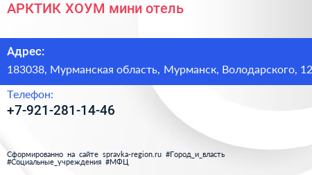 АРКТИК ХОУМ, мини-отель по адресу 183038, Мурманская область, Мурманск, Володарского, 12 в дальнейшем Организация, размещена в следующих категориях: