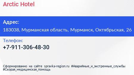 Arctic Hotel по адресу 183038, Мурманская область, Мурманск, Октябрьская, 26 в дальнейшем Организация, размещена в следующих категориях: