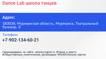 Dance Lab, школа танцев по адресу 183038, Мурманская область, Мурманск, Театральный бульвар, 8 в дальнейшем Организация, размещена в следующих категориях: