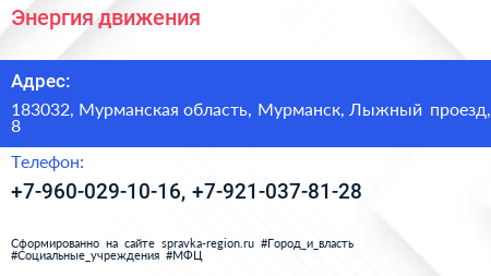 Энергия движения по адресу 183032, Мурманская область, Мурманск, Лыжный проезд, 8 в дальнейшем Организация, размещена в следующих категориях: