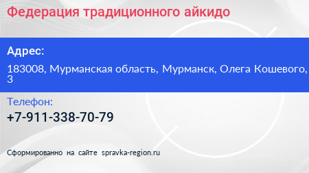 Федерация традиционного айкидо по адресу 183008, Мурманская область, Мурманск, Олега Кошевого, 3 в дальнейшем Организация, размещена в следующих категориях: