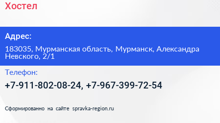 Хостел по адресу 183035, Мурманская область, Мурманск, Александра Невского, 2/1 в дальнейшем Организация, размещена в следующих категориях: