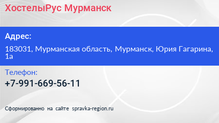 ХостелыРус Мурманск по адресу 183031, Мурманская область, Мурманск, Юрия Гагарина, 1а в дальнейшем Организация, размещена в следующих категориях: