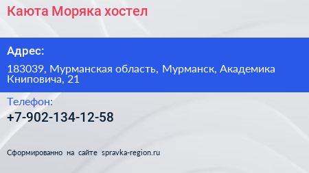Каюта Моряка, хостел по адресу 183039, Мурманская область, Мурманск, Академика Книповича, 21 в дальнейшем Организация, размещена в следующих категориях: