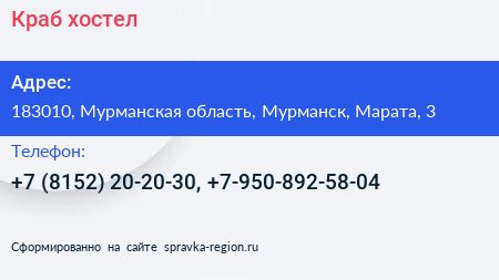 Краб, хостел по адресу 183010, Мурманская область, Мурманск, Марата, 3 в дальнейшем Организация, размещена в следующих категориях: