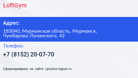 LoftGym по адресу 183040, Мурманская область, Мурманск, Чумбарова-Лучинского, 42 в дальнейшем Организация, размещена в следующих категориях: