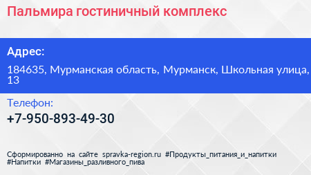 Пальмира, гостиничный комплекс по адресу 184635, Мурманская область, Мурманск, Школьная улица, 13 в дальнейшем Организация, размещена в следующих категориях: