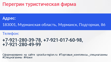 Перегрин, туристическая фирма по адресу 183001, Мурманская область, Мурманск, Подгорная, 86 в дальнейшем Организация, размещена в следующих категориях: