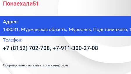 Понаехали51 по адресу 183031, Мурманская область, Мурманск, Подстаницкого, 1 в дальнейшем Организация, размещена в следующих категориях: