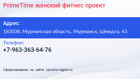 PrimeTime, женский фитнес-проект по адресу 183038, Мурманская область, Мурманск, Шмидта, 43 в дальнейшем Организация, размещена в следующих категориях: