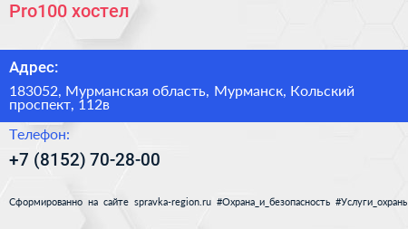 Pro100, хостел по адресу 183052, Мурманская область, Мурманск, Кольский проспект, 112в в дальнейшем Организация, размещена в следующих категориях: