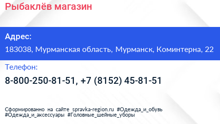 Рыбаклёв, магазин по адресу 183038, Мурманская область, Мурманск, Коминтерна, 22 в дальнейшем Организация, размещена в следующих категориях: