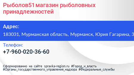 Рыболов51, магазин рыболовных принадлежностей по адресу 183031, Мурманская область, Мурманск, Юрия Гагарина, 3 в дальнейшем Организация, размещена в следующих категориях: