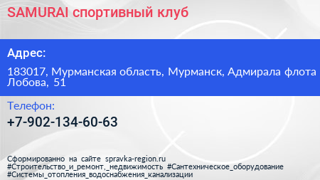 SAMURAI, спортивный клуб по адресу 183017, Мурманская область, Мурманск, Адмирала флота Лобова, 51 в дальнейшем Организация, размещена в следующих категориях:
