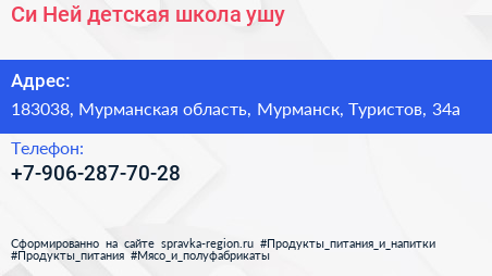 Си-Ней, детская школа ушу по адресу 183038, Мурманская область, Мурманск, Туристов, 34а в дальнейшем Организация, размещена в следующих категориях:
