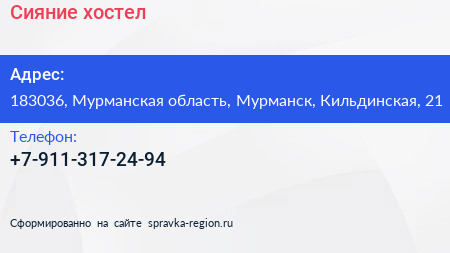 Сияние, хостел по адресу 183036, Мурманская область, Мурманск, Кильдинская, 21 в дальнейшем Организация, размещена в следующих категориях:
