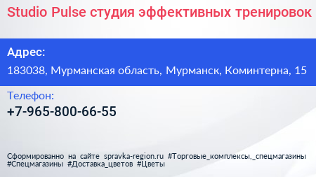 Studio Pulse, студия эффективных тренировок по адресу 183038, Мурманская область, Мурманск, Коминтерна, 15 в дальнейшем Организация, размещена в следующих категориях: