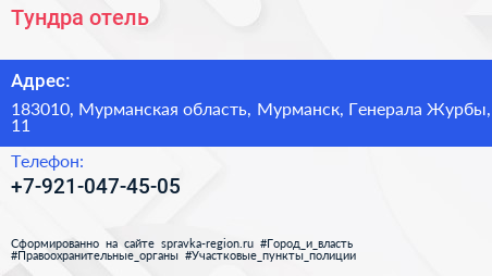Тундра, отель по адресу 183010, Мурманская область, Мурманск, Генерала Журбы, 11 в дальнейшем Организация, размещена в следующих категориях:
