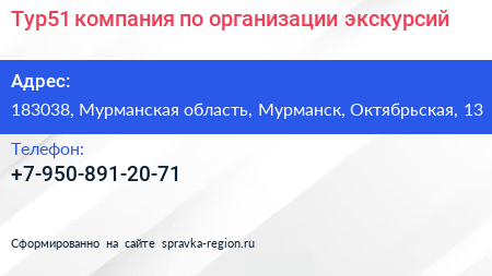 Тур51, компания по организации экскурсий по адресу 183038, Мурманская область, Мурманск, Октябрьская, 13 в дальнейшем Организация, размещена в следующих категориях: