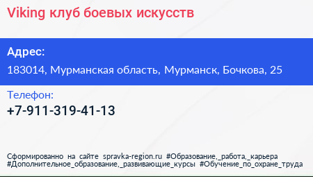 Viking, клуб боевых искусств по адресу 183014, Мурманская область, Мурманск, Бочкова, 25 в дальнейшем Организация, размещена в следующих категориях: