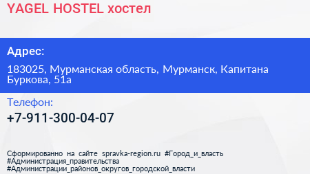 YAGEL HOSTEL, хостел по адресу 183025, Мурманская область, Мурманск, Капитана Буркова, 51а в дальнейшем Организация, размещена в следующих категориях:
