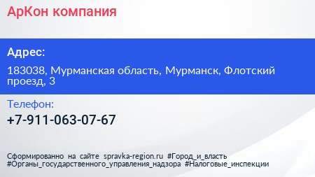 АрКон, компания по адресу 183038, Мурманская область, Мурманск, Флотский проезд, 3 в дальнейшем Организация, размещена в следующих категориях: