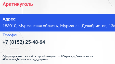 Арктикуголь по адресу 183010, Мурманская область, Мурманск, Декабристов, 13а в дальнейшем Организация, размещена в следующих категориях:
