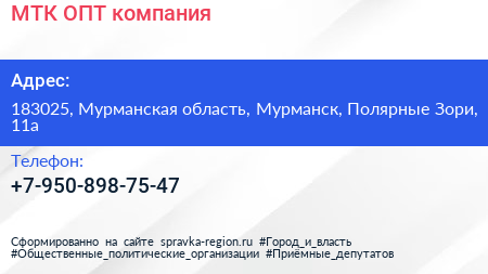 МТК ОПТ, компания по адресу 183025, Мурманская область, Мурманск, Полярные Зори, 11а в дальнейшем Организация, размещена в следующих категориях: