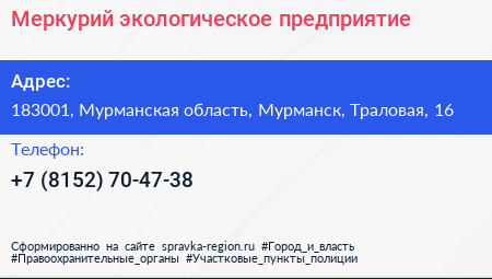Меркурий, экологическое предприятие по адресу 183001, Мурманская область, Мурманск, Траловая, 16 в дальнейшем Организация, размещена в следующих категориях: