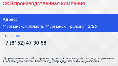 СКП, производственная компания по адресу Мурманская область, Мурманск, Траловая, 2/26 в дальнейшем Организация, размещена в следующих категориях: