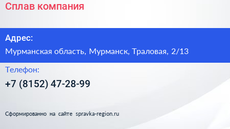 Сплав, компания по адресу Мурманская область, Мурманск, Траловая, 2/13 в дальнейшем Организация, размещена в следующих категориях:
