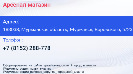 Арсенал, магазин по адресу 183038, Мурманская область, Мурманск, Воровского, 5/23 в дальнейшем Организация, размещена в следующих категориях: