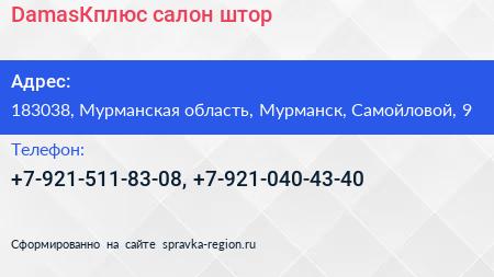 DamasКплюс, салон штор по адресу 183038, Мурманская область, Мурманск, Самойловой, 9 в дальнейшем Организация, размещена в следующих категориях: