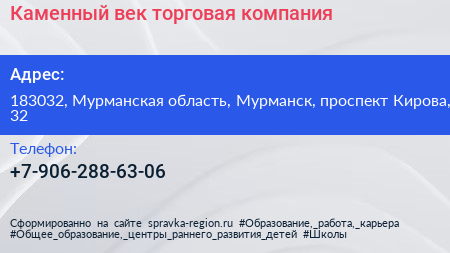 Каменный век, торговая компания по адресу 183032, Мурманская область, Мурманск, проспект Кирова, 32 в дальнейшем Организация, размещена в следующих категориях: