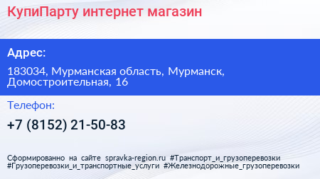 КупиПарту, интернет-магазин по адресу 183034, Мурманская область, Мурманск, Домостроительная, 16 в дальнейшем Организация, размещена в следующих категориях: