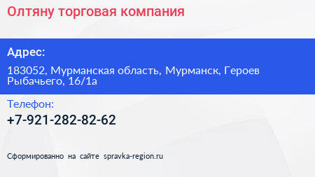 Олтяну, торговая компания по адресу 183052, Мурманская область, Мурманск, Героев Рыбачьего, 16/1а в дальнейшем Организация, размещена в следующих категориях: