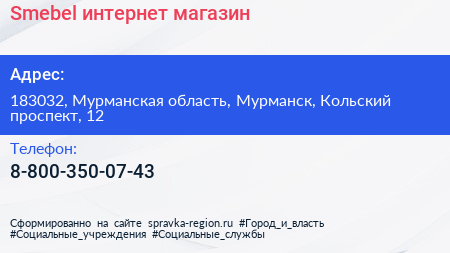 Smebel, интернет-магазин по адресу 183032, Мурманская область, Мурманск, Кольский проспект, 12 в дальнейшем Организация, размещена в следующих категориях: