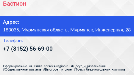 Бастион по адресу 183035, Мурманская область, Мурманск, Инженерная, 28 в дальнейшем Организация, размещена в следующих категориях: