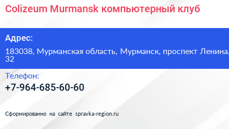 Colizeum Murmansk, компьютерный клуб по адресу 183038, Мурманская область, Мурманск, проспект Ленина, 32 в дальнейшем Организация, размещена в следующих категориях: