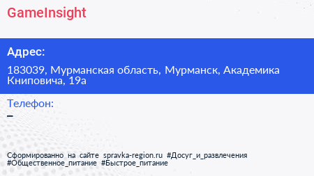 GameInsight по адресу 183039, Мурманская область, Мурманск, Академика Книповича, 19а в дальнейшем Организация, размещена в следующих категориях: