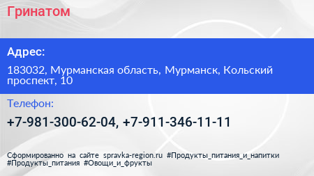 Гринатом по адресу 183032, Мурманская область, Мурманск, Кольский проспект, 10 в дальнейшем Организация, размещена в следующих категориях: